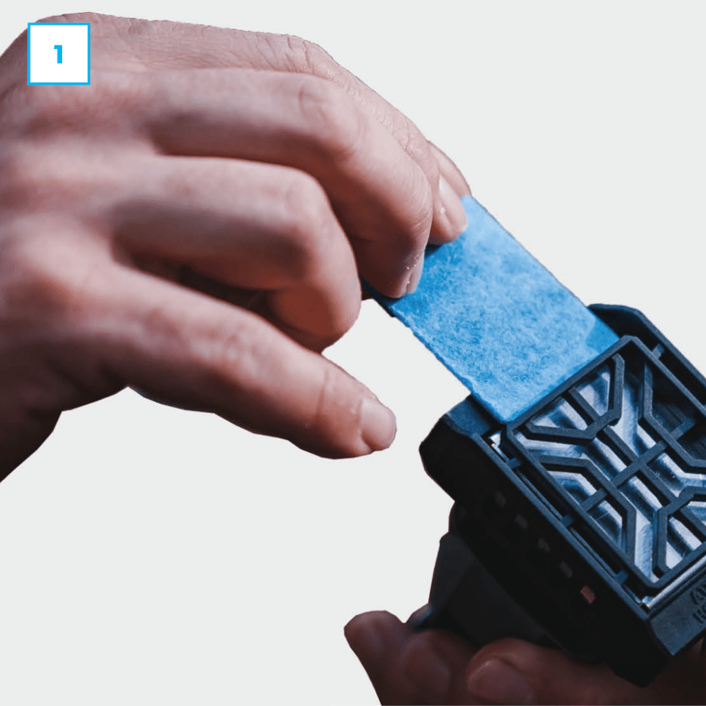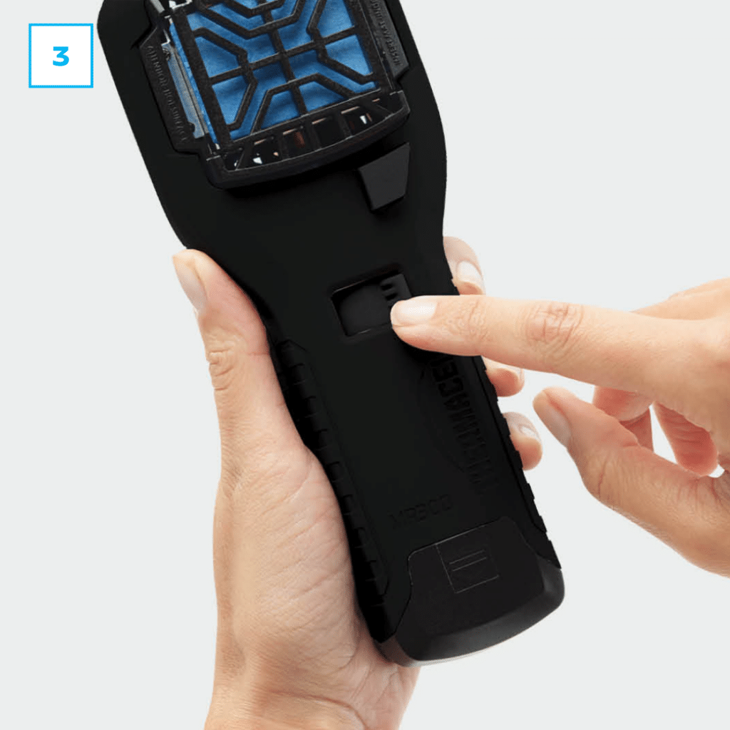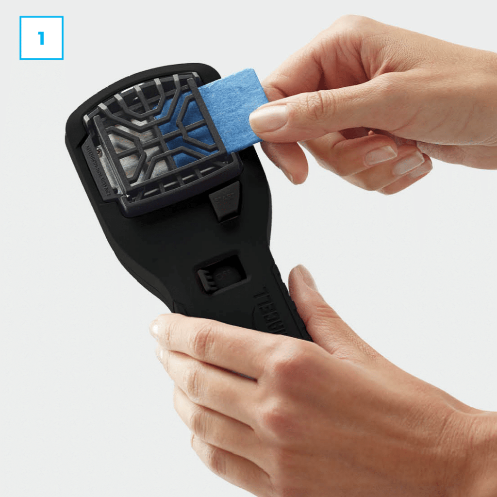 - Take one blue repellent mat from the pack and slide it under the grid on top of the device.