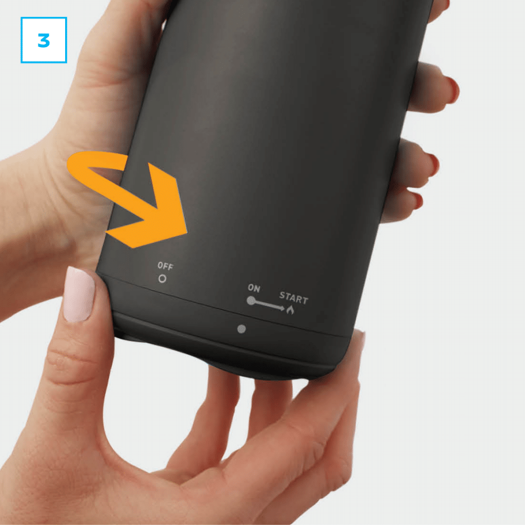 - After 5–10 seconds, turn the base further to START until it clicks. Check through the viewing window to ensure the filament is glowing red.