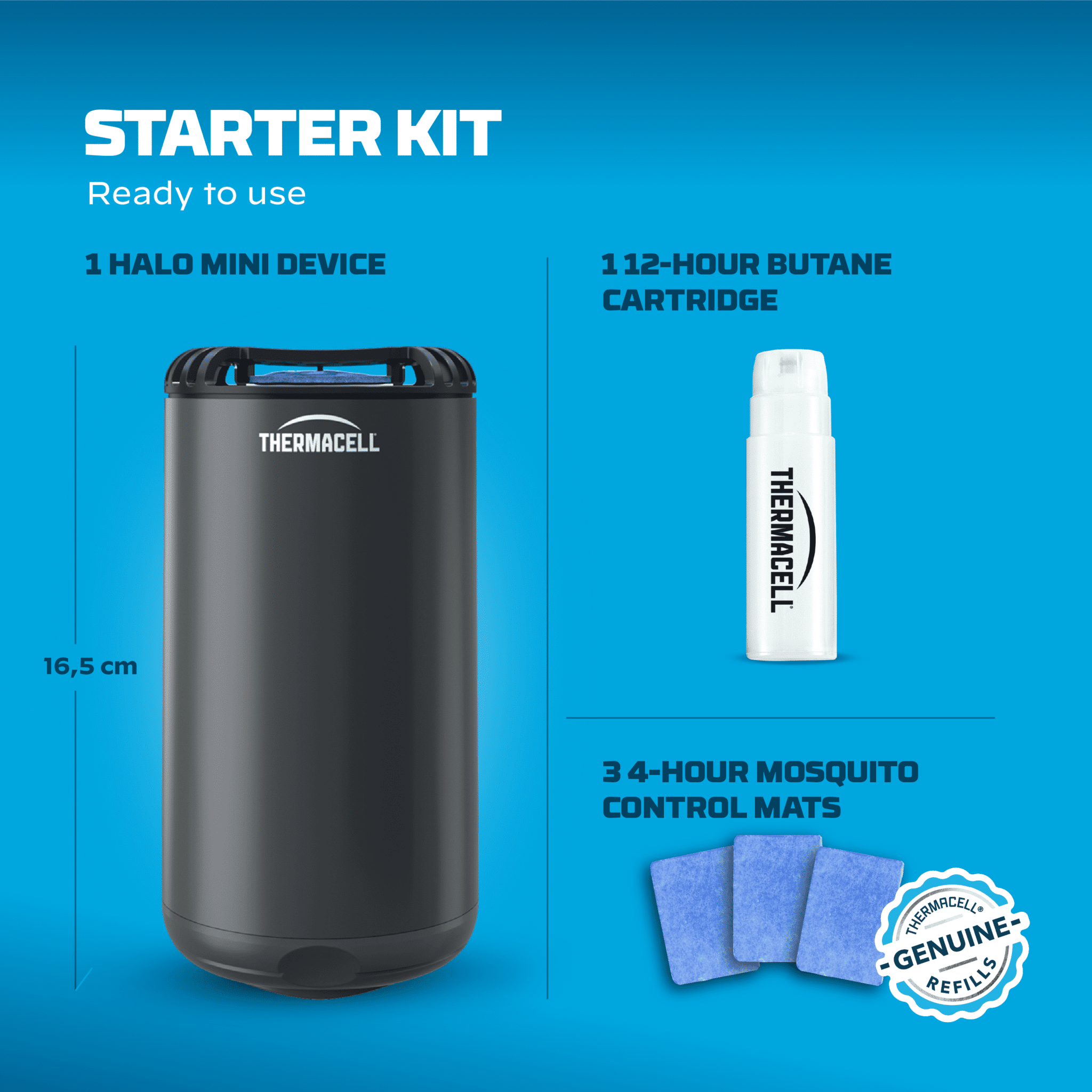 • Includes: 1 x protection device, 1 x 12-hour fuel cartridge, 3 x 4-hour repellent mats.